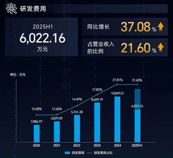從研發(fā)投入的絕對(duì)金額來看,2025年上半年,公司研發(fā)費(fèi)用投入高達(dá)6022.16萬(wàn)元,同比增長(zhǎng)37.08%,這一增速明顯高于營(yíng)收增速,顯示出公司對(duì)技術(shù)創(chuàng)新的高度重視。