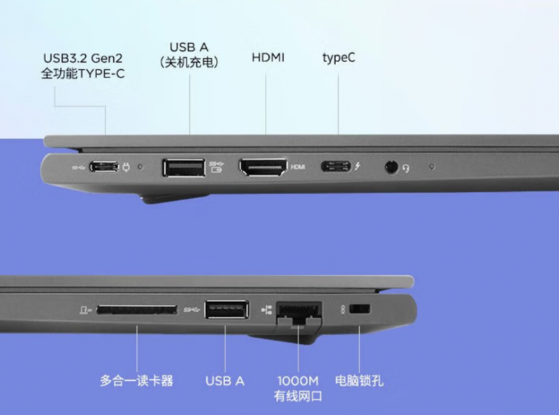 作為一臺面向主流商用市場的筆記本,聯(lián)想昭陽X5-14采用了全場景功能接口,擁有4個USB接口(含全功能Type-C*2,USB-A*2),HDMI接口和標準RJ45、MicroSD讀卡器,能夠輕松應對多種擴展與外設需求場景。在便攜性方面,其厚度薄至16.9mm,重量僅為1.38kg,非常方便攜帶外出,適用于不同商用場景下的辦公需求。