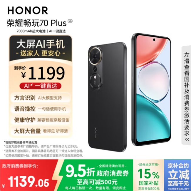 京東大屏AI手機榮耀暢玩70 Plus是京東聯(lián)合榮耀,通過C2M反向定制模式,打造的首款大屏AI手機。手機側(cè)面配備了實體AI鍵,清理加速、調(diào)整亮度、掃一掃等常用功能一鍵搞定;可以用語音點外賣、買藥、買菜,手機會自動跳轉(zhuǎn)到京東APP完成搜索,消費者可以直接下單。AI語音還可識別方言,即使不太會說普通話,也能用AI語音方式完成操作。這款手機京東11.11享政企雙補至高直降60元,到手至低1139元,還享3期免息補貼,送家人更安心。