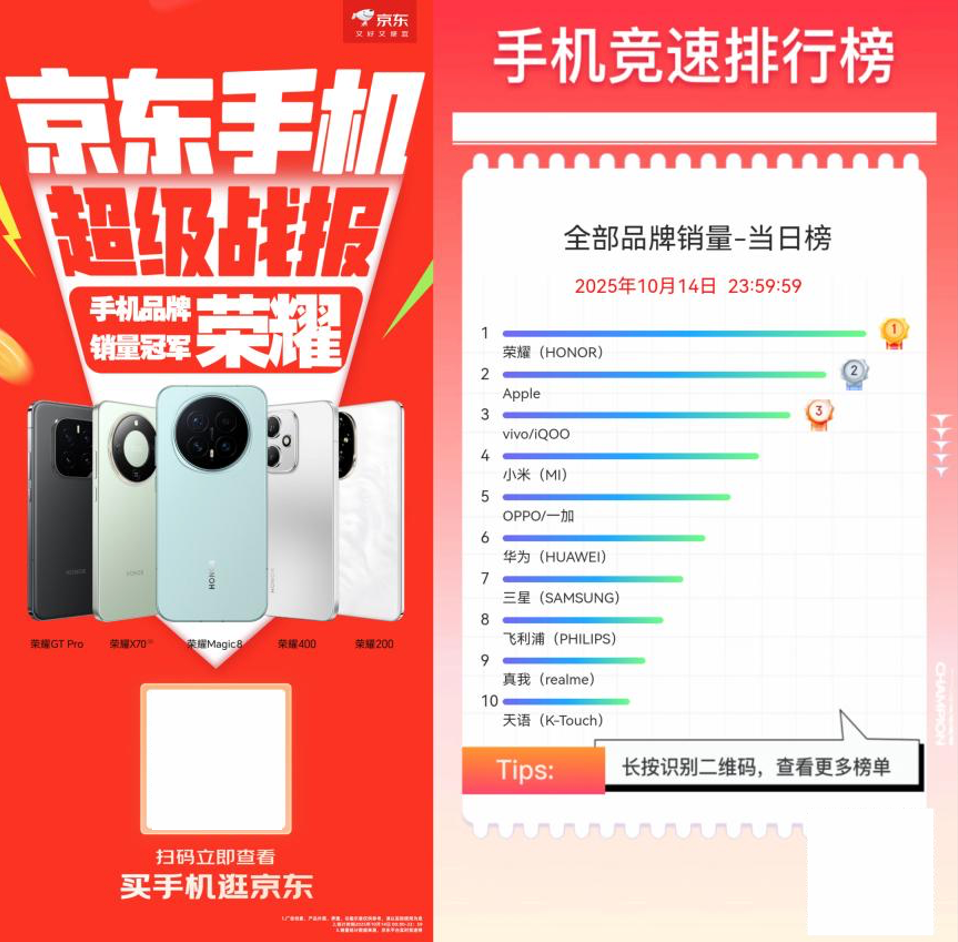 京東11.11手機競速榜競爭激烈 榮耀登頂10月14日品牌銷量榜第一