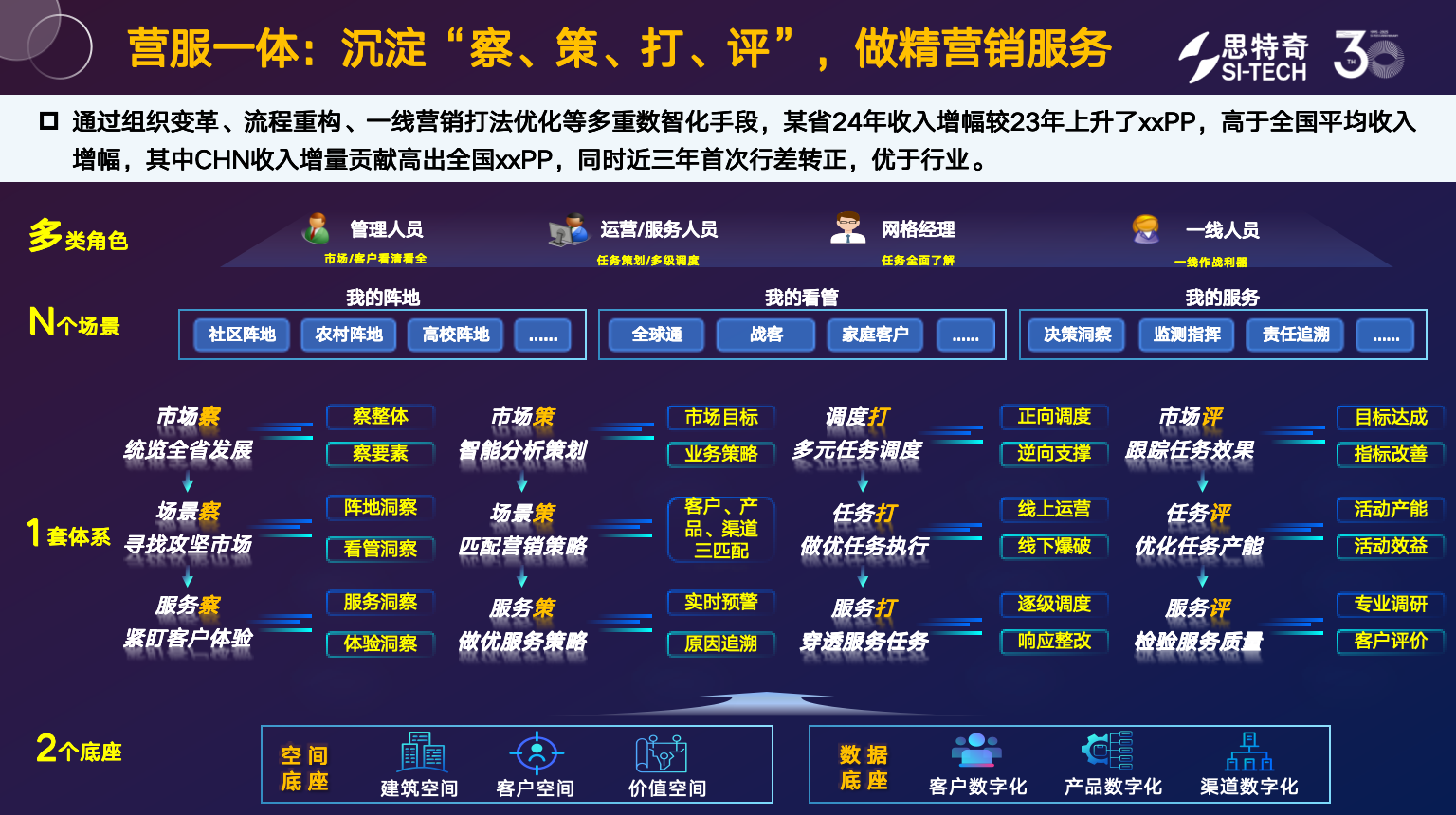 針對(duì)運(yùn)營(yíng)商大市場(chǎng)運(yùn)營(yíng)的核心痛點(diǎn),思特奇"市場(chǎng)全息作戰(zhàn)"方案以"存增一體、營(yíng)服一體"為戰(zhàn)略目標(biāo),構(gòu)建全鏈路指揮作戰(zhàn)體系,沉淀"察、策、打、評(píng)"四大核心能力,徹底激活市場(chǎng)數(shù)智化轉(zhuǎn)型動(dòng)能。該體系通過組織架構(gòu)革新打破部門壁壘、流程重構(gòu)優(yōu)化業(yè)務(wù)鏈路、一線打法升級(jí)提升執(zhí)行效能,形成"數(shù)據(jù)驅(qū)動(dòng)決策、智能賦能執(zhí)行"的閉環(huán)運(yùn)營(yíng)模式。