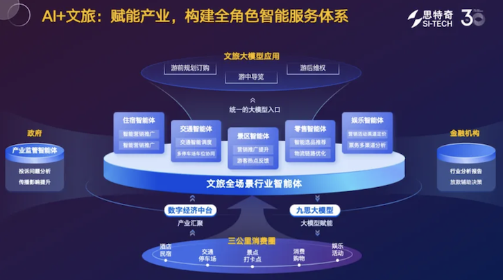 在文旅領域,思特奇以自研文旅大模型為核心,整合餐飲民宿、交通停車、景點打卡等"三公里消費圈"資源,構建覆蓋游客、企業(yè)、政府的全角色智能生態(tài)。通過住宿、交通、景區(qū)、零售、娛樂五大智能體協(xié)同,實現(xiàn)游前規(guī)劃、游中導覽、游后維權全流程服務;政府借助產業(yè)監(jiān)管智能體實現(xiàn)投訴分析與傳播預測,全方位激活文旅產業(yè)活力。