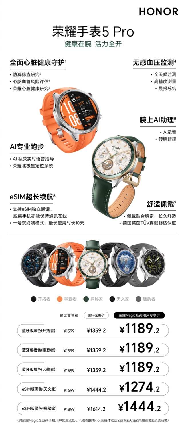 榮耀手表5 Pro自9月25日全渠道啟動(dòng)預(yù)售以來,市場(chǎng)反響熱烈,上市初期一度全渠道售罄,出現(xiàn)斷貨的熱銷盛況。10月23日,榮耀手表5 Pro正式開啟首銷,有藍(lán)牙和eSIM兩個(gè)版本可選,其中藍(lán)牙版本,攀登者(橙色)、開拓者(黑色)、遠(yuǎn)航者(灰色)首銷國補(bǔ)優(yōu)惠價(jià)1359.2元。eSIM版本,天文家(黑色)首銷國補(bǔ)優(yōu)惠價(jià)1444.2元,探秘家(綠色)首銷國補(bǔ)優(yōu)惠價(jià)1614.2元。首銷期榮耀Magic系列用戶,攀登者、開拓者、遠(yuǎn)航者專享國補(bǔ)優(yōu)惠價(jià)1189.2元,天文家專享國補(bǔ)優(yōu)惠價(jià)1274.2元,探秘家專享國補(bǔ)優(yōu)惠價(jià)1444.2元。