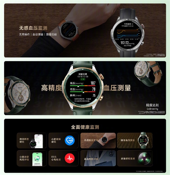 榮耀手表5 Pro作為榮耀手表最新的旗艦級(jí)智能產(chǎn)品,帶來了健康監(jiān)測(cè)管理的重大升級(jí),率先支持全天無感血壓監(jiān)測(cè),讓用戶無需手動(dòng)操作即可完成血壓監(jiān)測(cè),每日晨間自動(dòng)生成血壓晨報(bào)總結(jié),開啟腕上血壓管理新時(shí)代。除了全天無感血壓監(jiān)測(cè),榮耀手表5 Pro還提供不校準(zhǔn)無感風(fēng)險(xiǎn)評(píng)估,支持校準(zhǔn)后單次測(cè)量,精準(zhǔn)血壓測(cè)量出值,讓血壓監(jiān)測(cè)不再模糊不清,更加精準(zhǔn)可靠,測(cè)量結(jié)果一目了然,帶來全面領(lǐng)先的血壓監(jiān)測(cè)管理的全新體驗(yàn)。榮耀手表5 Pro支持24小時(shí)監(jiān)測(cè)用戶心臟狀態(tài),對(duì)疑似房顫、疑似早搏、疑似睡眠呼吸暫停、防猝篩查進(jìn)行風(fēng)險(xiǎn)篩查預(yù)警,全天候守護(hù)用戶健康。
