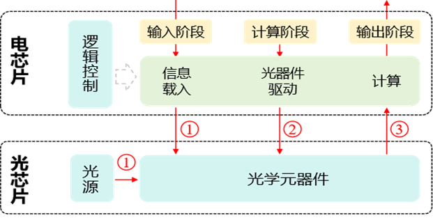 在光電混合架構(gòu)中,計算任務(wù)被拆分為線性與非線性兩部分,分別由光芯片與電芯片協(xié)同完成。其計算流程具體如下: