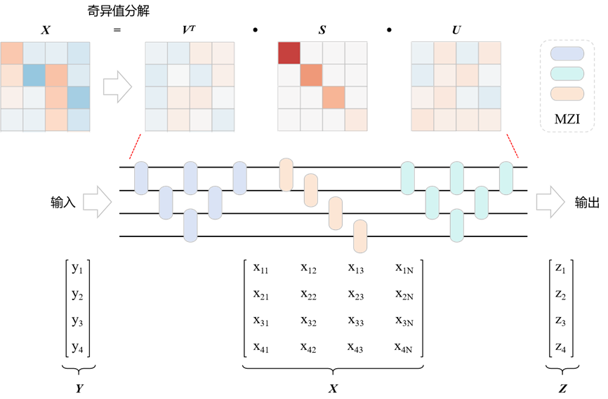 1.基于MZI陣列的矩陣向量乘法:MZI具有兩個輸入端口、兩個輸出端口,其傳輸矩陣可以表示為一個2×2酉矩陣。因此,高階矩陣運算可以通過二階MZI陣列實現(xiàn)。MZI陣列常用的拓?fù)浼壜?lián)方式有2種:三角陣列和矩陣陣列。