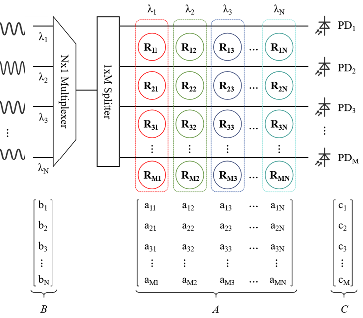2.基于MRR陣列的矩陣向量乘法:將數(shù)學(xué)上的矩陣與微環(huán)陣列進(jìn)行同構(gòu)映射,依賴于波分復(fù)用(Wavelength Division Multiplexing, WDM)技術(shù),輸入向量中的每個元素對應(yīng)于一個具有特定頻率或波長的輸入光,然后通過M×N規(guī)模的光學(xué)權(quán)重矩陣陣列對其進(jìn)行不同的幅度調(diào)節(jié),從而實現(xiàn)對輸入信號的加權(quán)。