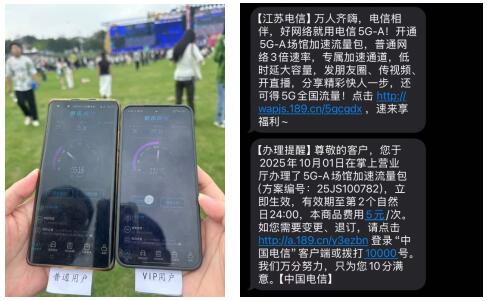 在數(shù)萬(wàn)人密集的音樂(lè)節(jié)現(xiàn)場(chǎng),率先加入體驗(yàn)的南京樂(lè)迷小李用5G-A網(wǎng)絡(luò)開(kāi)啟的高清直播全程無(wú)卡頓,“之前擔(dān)心人多網(wǎng)絡(luò)差,現(xiàn)在連4K畫(huà)質(zhì)都絲滑流暢。我剛拍下薛之謙的現(xiàn)場(chǎng)視頻,轉(zhuǎn)身就發(fā)了朋友圈,比身邊朋友快了足足半分鐘”。5G-A的飛速讓他成為朋友圈的“首評(píng)人”,此外,樂(lè)迷小李還有新發(fā)現(xiàn),他展示著手機(jī)上“電信場(chǎng)館VIP”的定制角標(biāo),這是辦理5G-A場(chǎng)館包后專(zhuān)屬的UE Logo標(biāo)識(shí)。 “真酷,太潮了!”