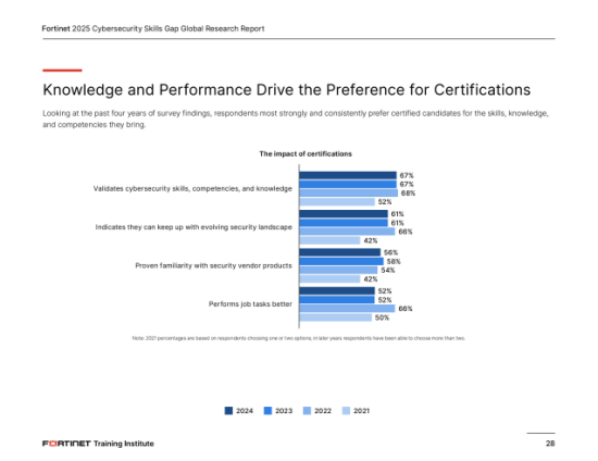 面對持續(xù)存在的人才短缺困境,專業(yè)認證的價值持續(xù)獲得業(yè)界認可。89%的IT決策者更傾向于雇用持有專業(yè)認證的候選人,認為認證能有效驗證知識儲備(67%)、體現(xiàn)技術適應能力(61%)并證實對關鍵工具的熟練度(56%)。然而,與此趨勢相悖的是,企業(yè)對認證資助的投入在2024年出現(xiàn)縮減,僅有73%的受訪者表示愿意為員工支付認證費用,低于2023年的89%。