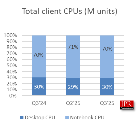JPR:全球客戶端 CPU 市場(chǎng) 2025Q3 環(huán)比增長(zhǎng) 2.2%、同比下降 2.2%