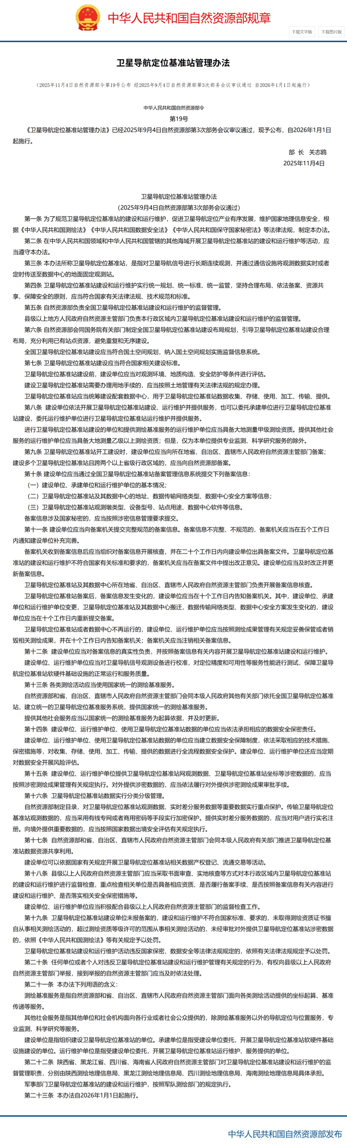 11 月 18 日消息,自然資源部今天公布了《衛(wèi)星導(dǎo)航定位基準(zhǔn)站管理辦法》(后簡稱《辦法》),從明年 1 月 1 日起,將對全國衛(wèi)星導(dǎo)航定位基準(zhǔn)站的建設(shè)和運行維護等全鏈條工作進(jìn)行統(tǒng)一規(guī)范管理