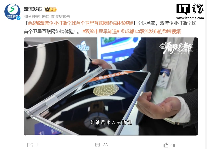 11 月 19 日消息,據(jù)“雙流發(fā)布”今日消息,成都迅翼衛(wèi)通科技有限公司(StarWin)“迅翼衛(wèi)通”衛(wèi)星互聯(lián)網(wǎng)線下體驗(yàn)店于 11 月 18 日正式開業(yè)運(yùn)營(yíng),這是全球首個(gè)衛(wèi)星互聯(lián)網(wǎng)終端體驗(yàn)店。