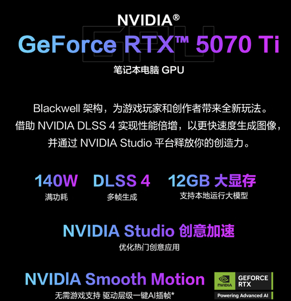 圖形性能上,ROG魔霸9還搭載140W滿功耗RTX 5070Ti筆記本電腦GPU,擁有12GB GDDR7大顯存,可輕松應對各類大型3A游戲中高精度貼圖以及高畫質(zhì)需求。此外,得益于全新Blackwell架構(gòu)與DLSS 4的加持,ROG魔霸9在運行諸如《賽博朋克2077》的3A大作時,在開啟4倍多幀生成后,可獲得電競級別的百幀幀數(shù),帶來遠超此前的游戲體驗。