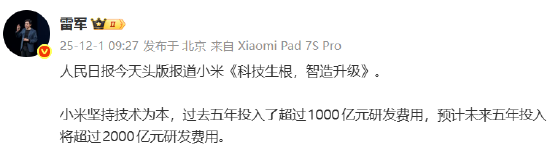 12月1日,小米公司創(chuàng)始人、董事長(zhǎng)、首席執(zhí)行官雷軍微博發(fā)文稱,人民日?qǐng)?bào)今天頭版報(bào)道小米《科技生根,智造升級(jí)》,并表示,小米堅(jiān)持技術(shù)為本,過去五年投入了超過1000億元研發(fā)費(fèi)用,預(yù)計(jì)未來五年投入將超過2000億元研發(fā)費(fèi)用。