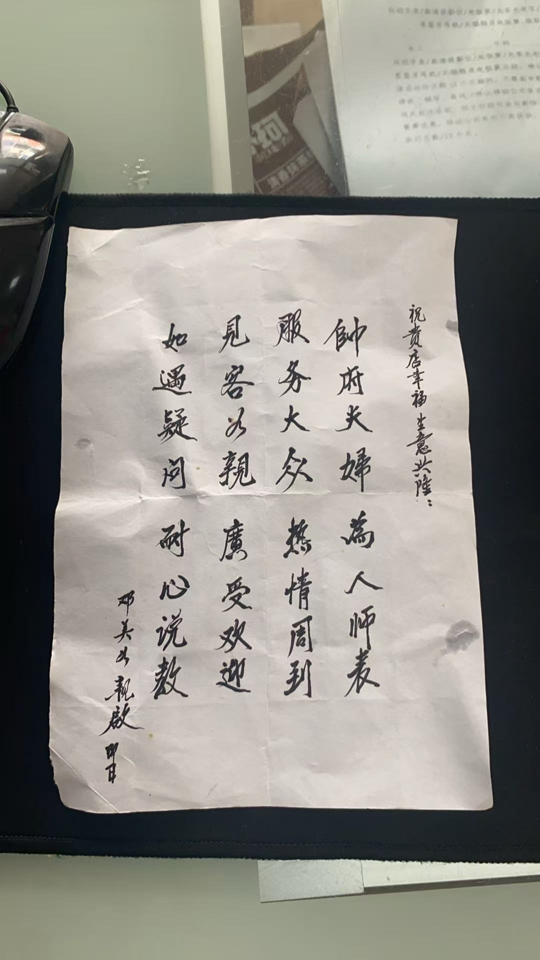 “帥府夫婦,為人師表,服務(wù)大眾,熱情周到……”一天上午,石港鎮(zhèn)街頭的五窯金莊服務(wù)廳來了一位80歲的老爺爺,他顫抖著雙手,將一封字跡工整的手寫感謝信遞到老板帥云飛的手中。信紙雖已泛黃,筆墨卻力透紙背,短短32個(gè)字,道盡了這位老人對這家開了十九年的服務(wù)廳最深的敬意!