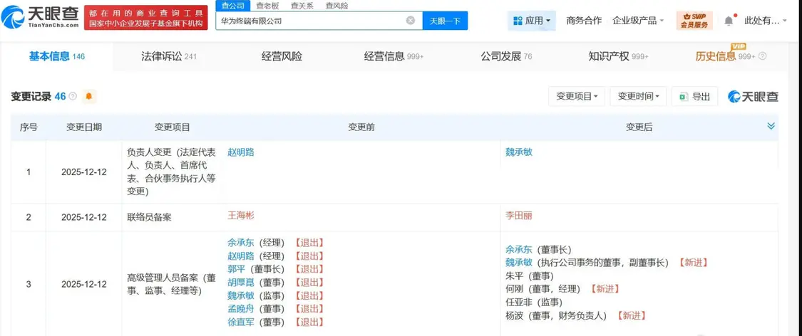 12月16日,天眼查工商信息顯示,近日,華為終端有限公司發(fā)生工商變更,原董事長郭平卸任,由余承東接任董事長一職,多位高管職務(wù)發(fā)生變更。