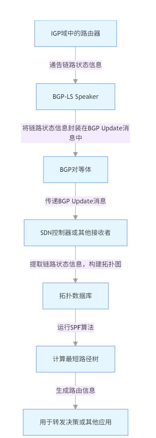 BGP-LS-SPF 功能涉及 BGP-LS(Border Gateway Protocol - Link State)收集網(wǎng)絡拓撲信息,再利用 SPF(Shortest Path First)算法計算最短路徑。其功能原理如下圖: