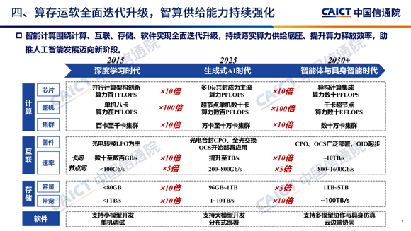 智能計(jì)算圍繞計(jì)算、互聯(lián)、存儲和軟件全面迭代升級,推動生成式AI邁向智能體和具身智能時代。計(jì)算上,單卡多芯片成為主流,超節(jié)點(diǎn)爆發(fā),萬卡集群加速構(gòu)建,2030年異構(gòu)計(jì)算集成是主流,整機(jī)和集群容量大增;數(shù)據(jù)中心互聯(lián)呈現(xiàn)光電融合趨勢,速率提升顯著;存儲容量和帶寬大幅提升;軟件向多模態(tài)協(xié)作等方向發(fā)展。網(wǎng)絡(luò)能力持續(xù)發(fā)展,支撐萬物智聯(lián)與AI發(fā)展,移動和固定寬帶向萬兆提升,骨干網(wǎng)絡(luò)加速向超寬帶全光底座演進(jìn),推進(jìn)算網(wǎng)融合,以實(shí)現(xiàn)泛在連接與算力資源敏捷供給。