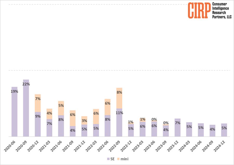 3 月 13 日消息,消費者情報研究伙伴公司(CIRP)昨日(3 月 12 日)發(fā)布博文,報道稱蘋果的入門 iPhone 機型(包括 iPhone SE 和 iPhone mini 系列)雖然銷量占比持續(xù)下滑至 5%,但其整體表現(xiàn)依然強勁。