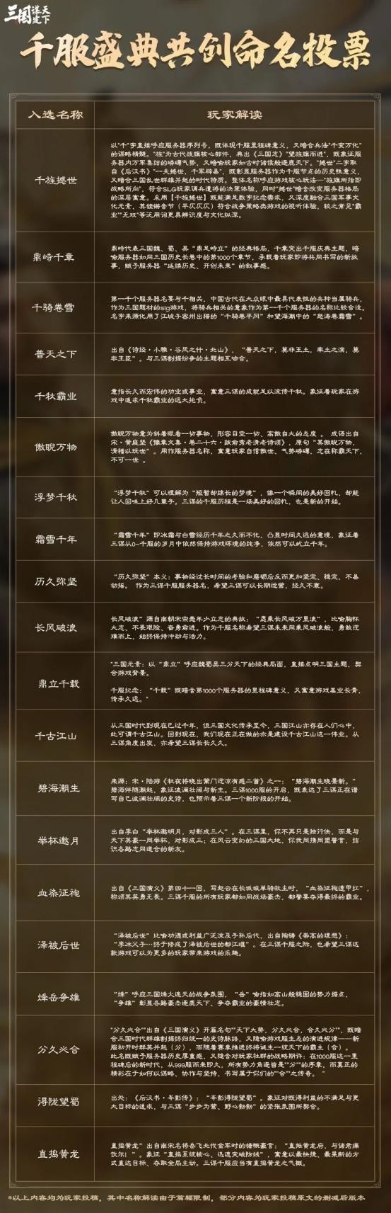 經(jīng)由游戲綜合考量創(chuàng)意深度、文化內(nèi)涵等多維度標(biāo)準(zhǔn),最終20個獨具特色的服務(wù)器名稱脫穎而出,成功晉級投票階段。同時,通過數(shù)千名主公的踴躍投票,「千服盛典」的服務(wù)器命名共創(chuàng)結(jié)果已經(jīng)誕生,其中“普天之下”得票率最高。