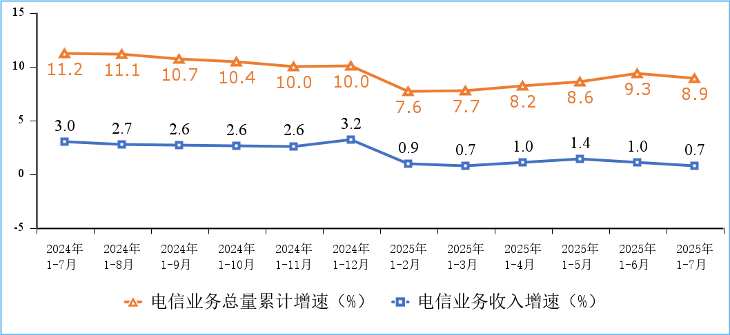 飛象網(wǎng)訊(致新/文)8月27日消息,2025年前7個(gè)月,我國(guó)通信業(yè)運(yùn)行總體平穩(wěn),電信業(yè)務(wù)收入累計(jì)完成10431億元,同比增長(zhǎng)0.7%。按照上年不變價(jià)計(jì)算的電信業(yè)務(wù)總量同比增長(zhǎng)8.9%。
