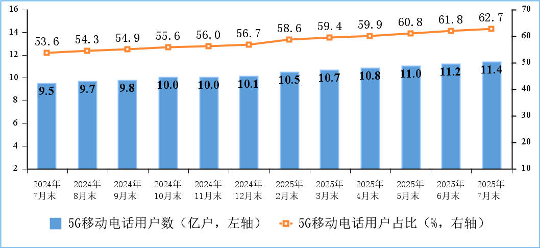 5G用戶數(shù)快速增加。截至7月末,三家基礎(chǔ)電信企業(yè)及中國(guó)廣電的移動(dòng)電話用戶總數(shù)達(dá)18.15億戶,比上年末凈增2508萬(wàn)戶。其中,5G移動(dòng)電話用戶達(dá)11.37億戶,比上年末凈增1.23億戶,占移動(dòng)電話用戶的62.7%。