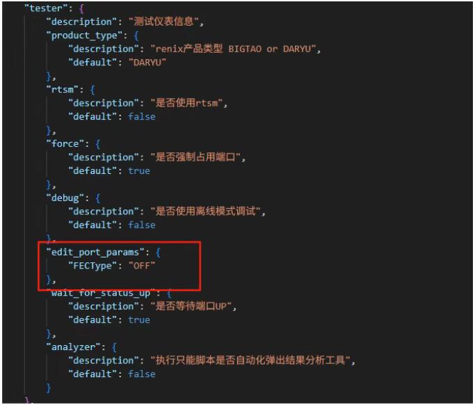 測(cè)試儀表產(chǎn)品類型分為BigTao和DarYu,不同端口速率的適配,在testbed.json文件中修改"edit_port_params"可以對(duì)測(cè)試儀的端口參數(shù)進(jìn)行設(shè)置,如下圖示為端口設(shè)置關(guān)閉FEC。