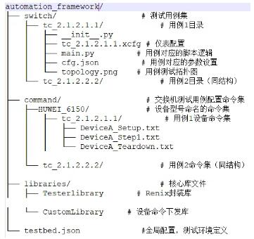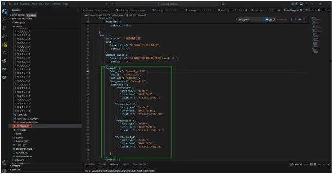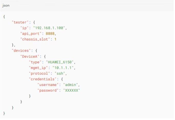 測(cè)試拓?fù)溥B接信息寫(xiě)入testbed.json文件中,修改對(duì)應(yīng)的測(cè)試儀表,交換機(jī)設(shè)備的 ip 和實(shí)際端口即可適配不同的測(cè)試環(huán)境。