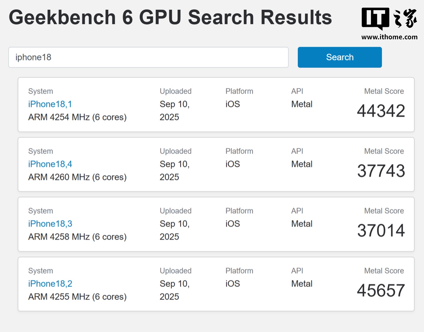 查詢 GeekBench 跑分庫,目前共有 iPhone18,1、iPhone18,2、iPhone18,3 和 iPhone18,4 四條記錄,其中 iPhone18,2 的 Metal 跑分最高,為 45657 分;iPhone18,3 的 Metal 跑分最低,為 37014 分。