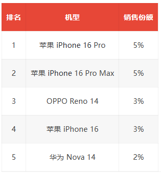 9 月 11 日消息,市場(chǎng)調(diào)查機(jī)構(gòu) CounterPoint Research 昨日(9 月 10 日)發(fā)布博文,報(bào)告了 2025 年 6 月中國(guó)市場(chǎng)最暢銷 5 款智能手機(jī)機(jī)型,其中 iPhone 16 Pro 和 iPhone 16 Pro Max 均以 5% 份額,位居榜首。