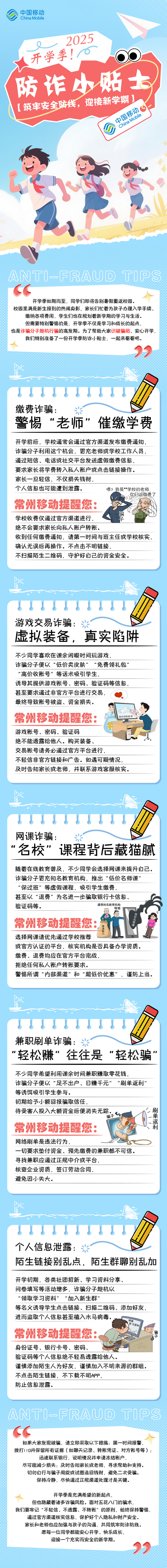 開學(xué)季如期而至,同學(xué)們即將告別暑假重返校園。校園里滿是新生報(bào)到的熱鬧身影,家長們忙著為孩子辦理入學(xué)手續(xù)、繳納各項(xiàng)費(fèi)用,學(xué)生們也在規(guī)劃著新學(xué)期的學(xué)習(xí)與生活。但需要特別警惕的是,開學(xué)季不僅是學(xué)習(xí)和成長的起點(diǎn),也是詐騙分子趁機(jī)行騙的高發(fā)期。為了幫助大家識破騙局、安心開學(xué),我們特別準(zhǔn)備了一份開學(xué)季防詐小貼士,一起來看看吧!
