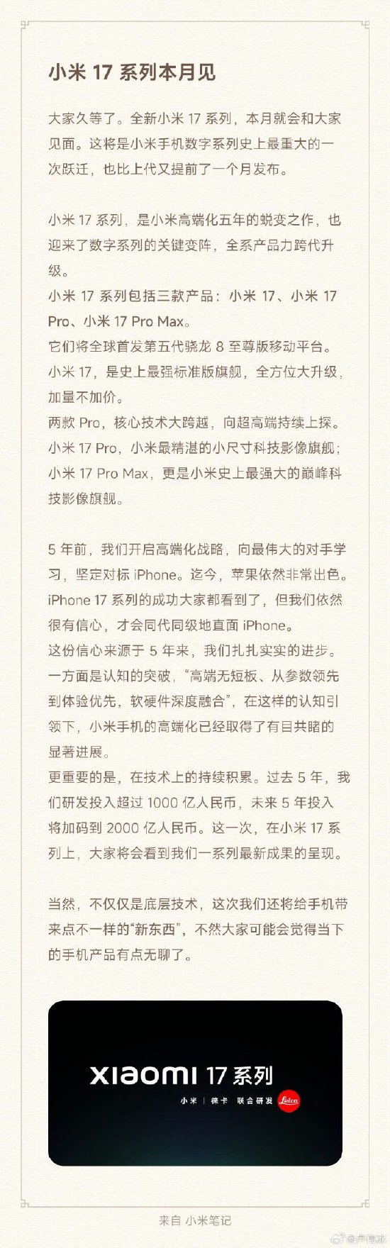 小米集團合伙人、總裁,手機部總裁,小米品牌總經理盧偉冰9月15日宣布,全新小米17系列,本月就會和大家見面。