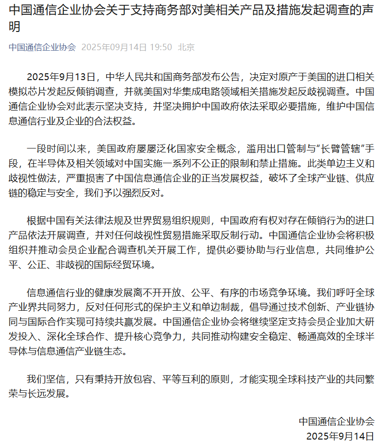 2025 年 9 月 13 日,中華人民共和國商務部發(fā)布公告,決定對原產于美國的進口相關模擬芯片發(fā)起反傾銷調查,并就美國對華集成電路領域相關措施發(fā)起反歧視調查。中國通信企業(yè)協(xié)會對此表示堅決支持,并堅決擁護中國政府依法采取必要措施,維護中國信息通信行業(yè)及企業(yè)的合法權益。