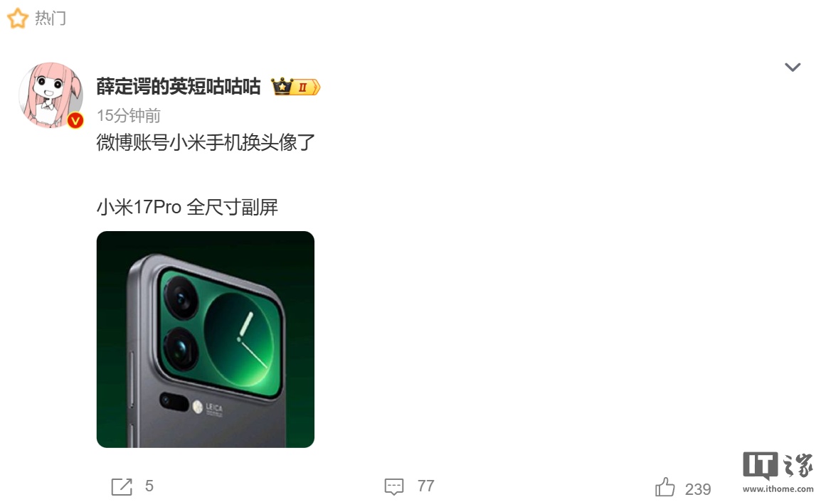 小米手機(jī)官博頭像意外泄露新機(jī)背屏,預(yù)計為 17 Pro 系列