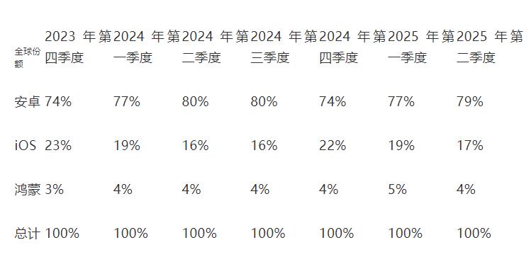 2023 年第 4 季度到 2025 年第 2 季度全球手機(jī)系統(tǒng)分布情況