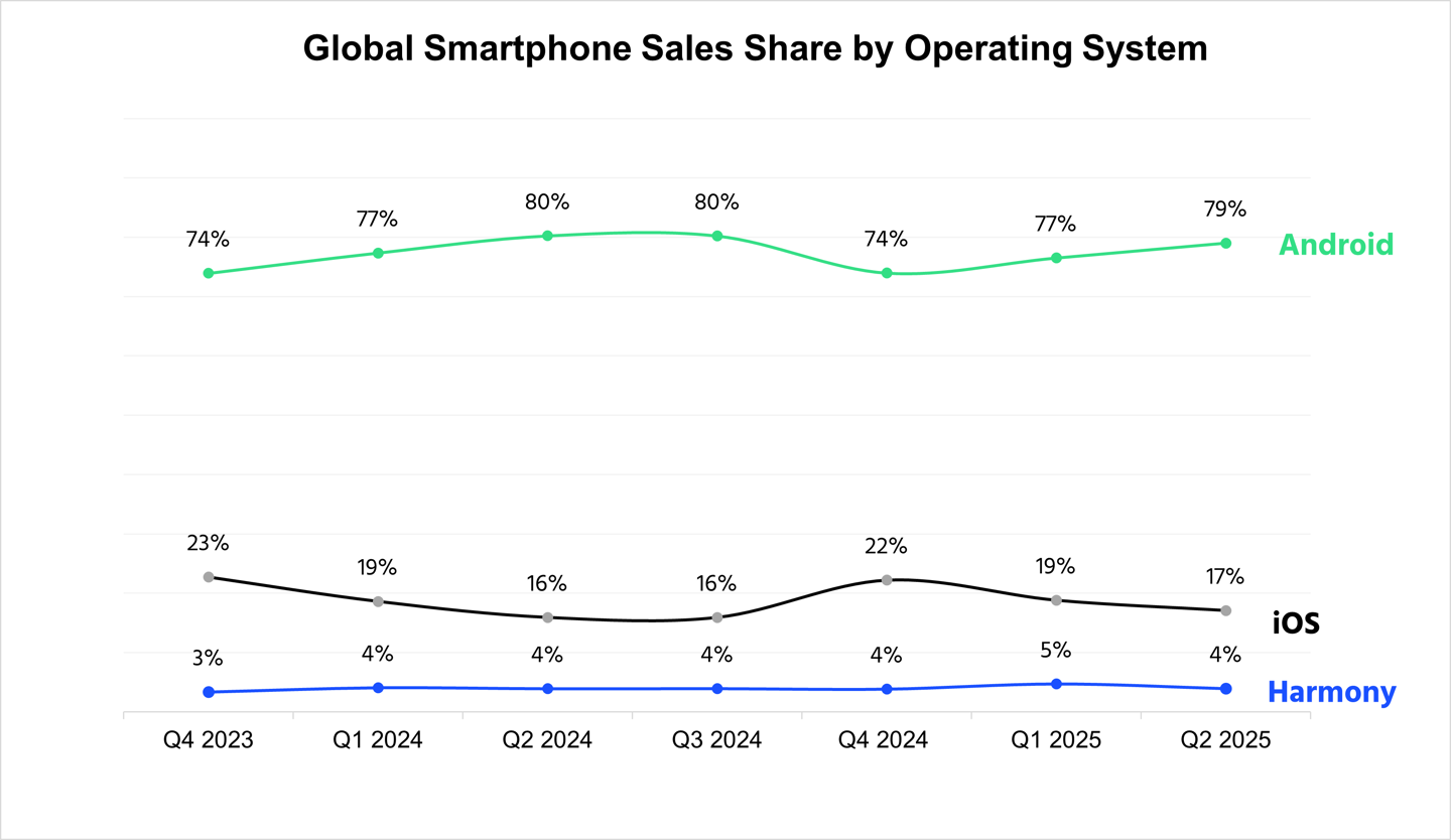 市場調(diào)查機(jī)構(gòu) CounterPoint Research 昨日(9 月 22 日)發(fā)布博文,報(bào)道稱在 2025 年第 2 季度全球智能手機(jī)銷量同比增長 5%,其中安卓系統(tǒng)占比 79%,蘋果 iOS 系統(tǒng)占比 17%,鴻蒙系統(tǒng)占比 4%。