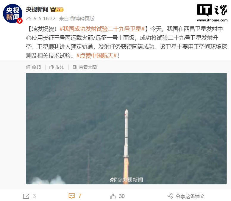9 月 5 日消息,據(jù)央視新聞報(bào)道,北京時(shí)間 2025 年 9 月 5 日 10 時(shí) 34 分,我國在西昌衛(wèi)星發(fā)射中心使用長(zhǎng)征三號(hào)丙運(yùn)載火箭 / 遠(yuǎn)征一號(hào)上面級(jí),成功將試驗(yàn)二十九號(hào)衛(wèi)星發(fā)射升空,衛(wèi)星順利進(jìn)入預(yù)定軌道,發(fā)射任務(wù)獲得圓滿成功。