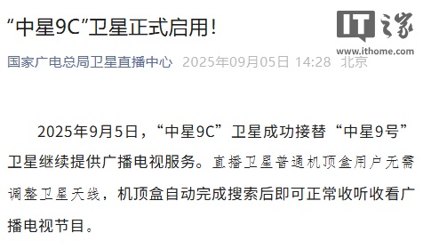 9 月 5 日消息,國家廣播電視總局宣布,“中星 9C”衛(wèi)星今日正式接替服役多年的“中星 9 號(hào)”衛(wèi)星,繼續(xù)為全國用戶提供廣播電視服務(wù),用戶無需調(diào)整設(shè)備即可正常接收信號(hào)。