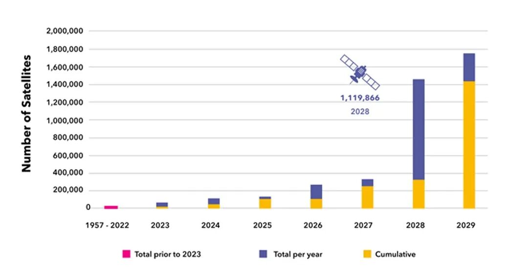 與此同時,軌道與頻段資源的爭奪已進入白熱化階段,ITU報告顯示成員國申請登記無線電頻率的非對地靜止衛(wèi)星數量將在2029年達到近180萬顆。地球同步軌道和黃金頻段的容量本就有限,過度發(fā)射不僅會引發(fā)軌道擁堵和衛(wèi)星碰撞的潛在風險,而國際電信聯(lián)盟(ITU)“先到先得” 的規(guī)則,更進一步加劇了這種無序競爭。