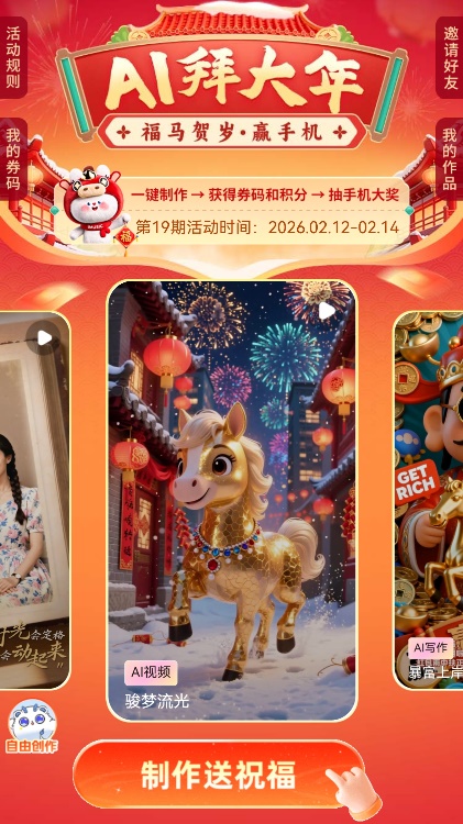 打開小程序,春節(jié)氛圍撲面而來。“八方來財(cái)”“馬上大吉”“馬上轉(zhuǎn)運(yùn)”……的吉祥話、“卡通拜年合家歡”“Horse(好事)成雙”的拜年場(chǎng)景……一片紅紅火火。