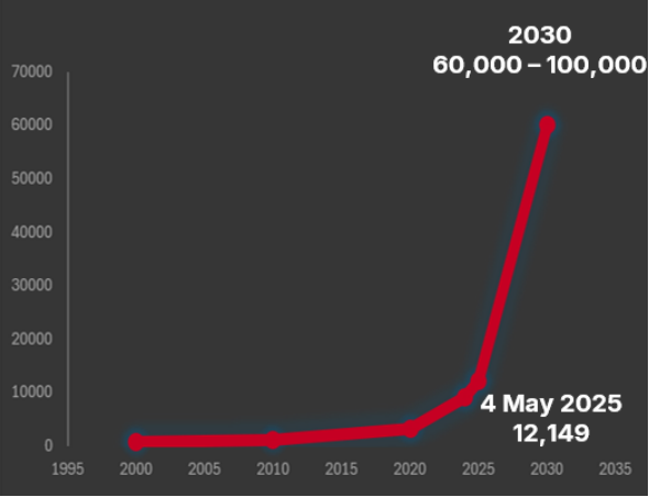 圖1:2000年至2030年的在軌活躍衛(wèi)星數(shù)量
