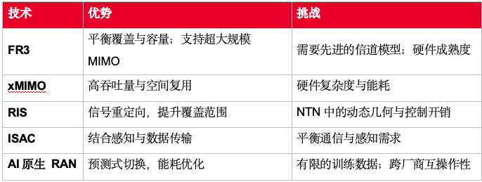 這些技術共同構成了智能化、自適應、由NTN賦能的6G生態(tài)系統(tǒng)的基石。不過,每項技術也都具備其獨特優(yōu)勢與挑戰(zhàn)(見表1)。