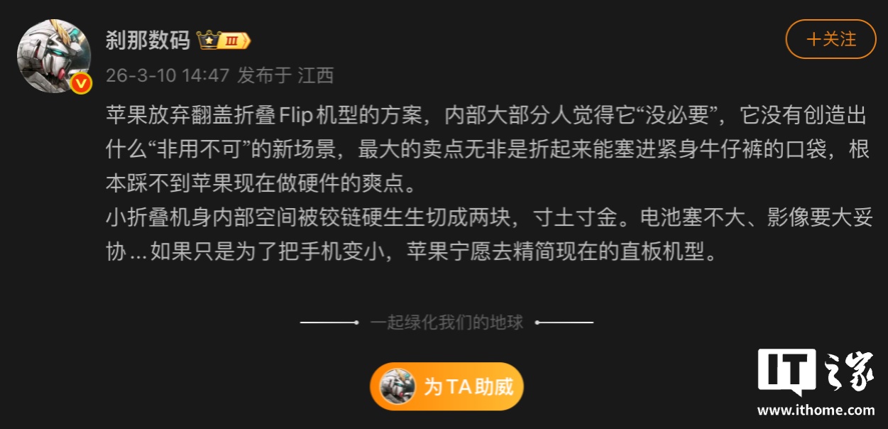 3 月 11 日消息,博主 @剎那數(shù)碼發(fā)文,透露蘋果放棄了翻蓋小折疊 Flip 機型的方案,這是因為內(nèi)部大部分人覺得它“沒必要”,它沒有創(chuàng)造出什么“非用不可”的新場景,最大的賣點無非是折起來能塞進緊身牛仔褲的口袋,“根本踩不到蘋果現(xiàn)在做硬件的爽點”。