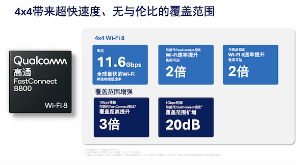 高通發(fā)布的高通FastConnect 8800移動(dòng)連接系統(tǒng),具備多個(gè)領(lǐng)先特性。它是迄今為止全球速度最快、覆蓋距離最遠(yuǎn)的移動(dòng)Wi‑Fi方案,峰值物理層速率可達(dá)11.6Gbps,也是全球唯一一款將Wi‑Fi 8、藍(lán)牙7、最新UWB與最新Thread等下一代連接技術(shù)集成于單一芯片的解決方案。同時(shí),它還采用了近距離感知技術(shù),并通過(guò)系統(tǒng)級(jí)AI優(yōu)化加以增強(qiáng)。